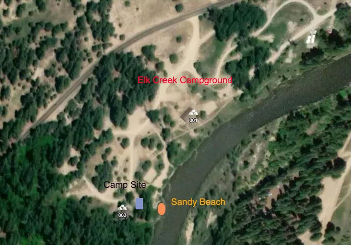 Next, you’ll drive through Pine to Elk Flats campground. If possible, get a campsite on the river. There is only one spot with a sandy beach, which is located in the group camping area near spot #2. See map image below for reference. If there are no group reservations, you can camp there and pay the standard day rate (rather than group rate). Even if you’re unable to find a campsite adjacent to this beachy area, you can always walk down and access the river using the trails within the campground.