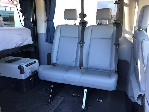 Adding more seats to your campervan rental is super easy: Select the 2nd row seating option in our Medium and Small vans (two seater available). If you’re booking a Large Campervan, the floor plan will allow for a second row of seats for 3 people, plus a third row of seats can be installed to seat 2 more passengers. That means a total of 7 seats can optionally be added to the Large campervan. Please NOTE: all of our additional seating has at least 1 child car seat anchor in place. Plus, all of these seats are manufactured by Ford and are designed and rated to meet all safety requirements.